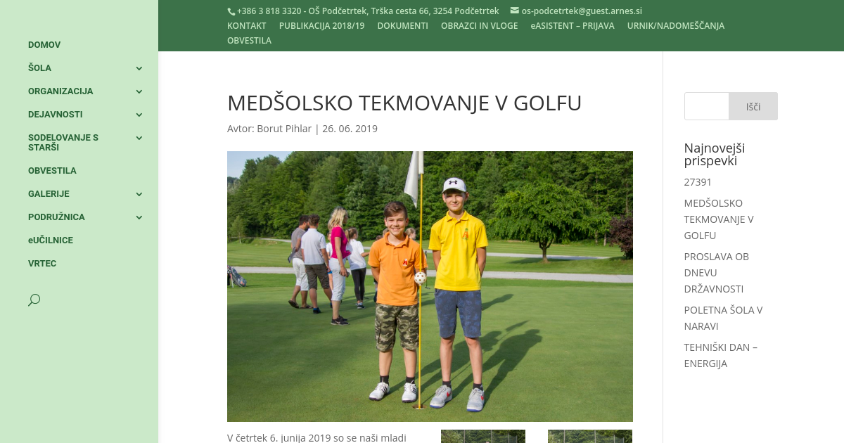 V četrtek 6. junija 2019 so se naši mladi golfisti udeležili medšolskega tekmovanja v golfu, ki ga je odlično organiziral ”A” golf klub Olimje. Sodelovali smo z dvema petčlanskima ekipami. Ekipe so se najprej pomerile v golfskih veščinah, kjer sta naše dve ekipi zasedle prvo in drugo mesto. Tri najboljše ekipe prvega dela so se nato z dvema članoma pomerile še v igri na igrišču, kjer sta po razburljivem boju, Matic Tacer in David Amadej Plevnik morala priznati premoč paru iz OŠ Šmarje pri Jelšah. Rezultati: 2. mesto Podčetrtek 1 ( Matic Tacer, David Amadej Plevnik, Aleš Kliček, Amadeja Jereb, Sara Amon) 3. mesto Podčetrtek 2 ( Aljaž Amon, Matic Plevnik, Neja Amon, Eva Humski, Teja Amon)