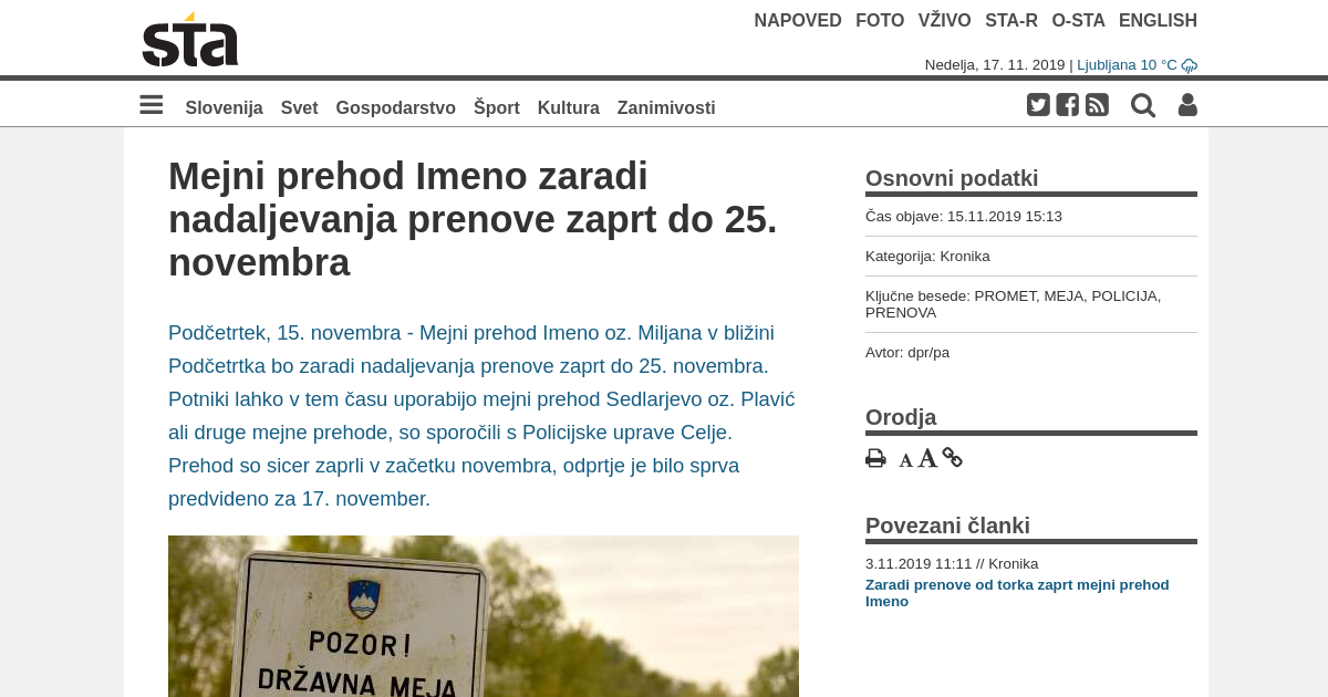 Mejni prehod Imeno oz. Miljana v bližini Podčetrtka bo zaradi nadaljevanja prenove zaprt do 25. novembra. Potniki lahko v tem času uporabijo mejni prehod Sedlarjevo oz. Plavić ali druge mejne prehode, so sporočili s Policijske uprave Celje. Prehod so sicer zaprli v začetku novembra, odprtje je bilo sprva predvideno za 17. november.