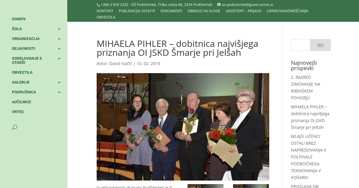 “Gospa Mihaela Pihler je, vsestransko, akademsko izobražena glasbenica in izredna strokovna vodja. Vodila je veliko zelo uspešnih vokalnih sestavov in z njimi nastopala tudi na najvišjem tekmovanju zborov Sloveniji Naša pesem, kjer so dosegli visoka priznanja. Med drugim je bila je bila zborovodja v zasedbah, kot so: Mešani mladinski pevski zbor Veter Ljubljana, Komorni moški pevski zbor Celje, Vokalna skupina Freya iz Šmarja, Vokalna skupina Pegazove muze iz Rog. Slatine, v Podčetrtku pa v vokalni zasedbi Osti jarej. Še vedno je v Podčetrtku umetniški vodja VS Emine, ki jo je tudi ustanovila, in Mešanega cerkvenega pevskega zbora. Kot strokovni vodja vodi Cerkveni mešani pevski zbor Podčetrtek od l. 2010. Pod njenim vodstvom je zbor doživel pravi preobrat, saj gospa Mihaela s svojimi idejami, fleksibilnostjo, z neumorno energijo daje zboru moč in samozavest, da zmore več, kot so kdaj sanjali. Zbor je pridobil na kvaliteti in si v slovenskem kulturnem prostoru utrdil svoj prostor. Pod njenim vodstvom uspešno nastopa na prireditvah v kraju, dosega visoke uvrstitve na pevskih revijah, se povezuje s pevskimi sestavi iz drugih krajev in sodeluje z vrhunskimi glasbeniki. Gospa Mihaela Pihler se odlikuje tudi kot odlična mentorica svojim učencem. Občudovanja vredni so nastopi, ki jih izvaja z učenci Osnovne šole Podčetrtek. Vsakemu otroku daje možnost, da pride na oder in sodeluje. Zaupa jim tudi najbolj zahtevne skladbe. Petje nas povezuje in združuje. Peti pod taktirko ga. Mihaele je veliko lažje.”