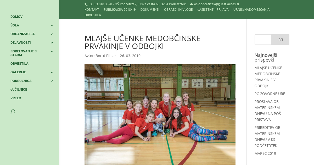 V torek, 26. marca, je naša šola gostila medobčinsko tekmovanje v odbojki za mlajše učenke. Zaradi nekaterih odpovedi, je bila udeležba okrnjena. Naša dekleta so v finalu gladko s 3:0 odpravile vrstnice iz OŠ Rogatec in tako že tretje leto zapored postale medobčinske prvakinje.