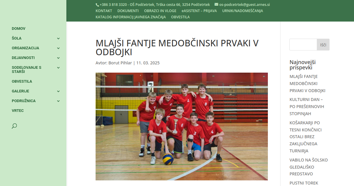 OŠ Rogatec je gostila medobčinsko tekmovanje v odbojki za mlajše učence. Naši učenci so ponovili lanski uspeh in ponovno postali medobčinski prvaki. Po gladki zmagi nad vrstniki iz Kozjega so v finalu v izenačeni in napeti končnici strli odpor domačinov in zmagali z 2:1 v nizih. Čestitke. Sodelovali so: Leon Mrkša, Nejc Turk, Tjaž Šket, Niko Hohnjec, Mark Debelak, Kristian Vozlič (kap.), Anej Jagrič in Adam Dolinar.