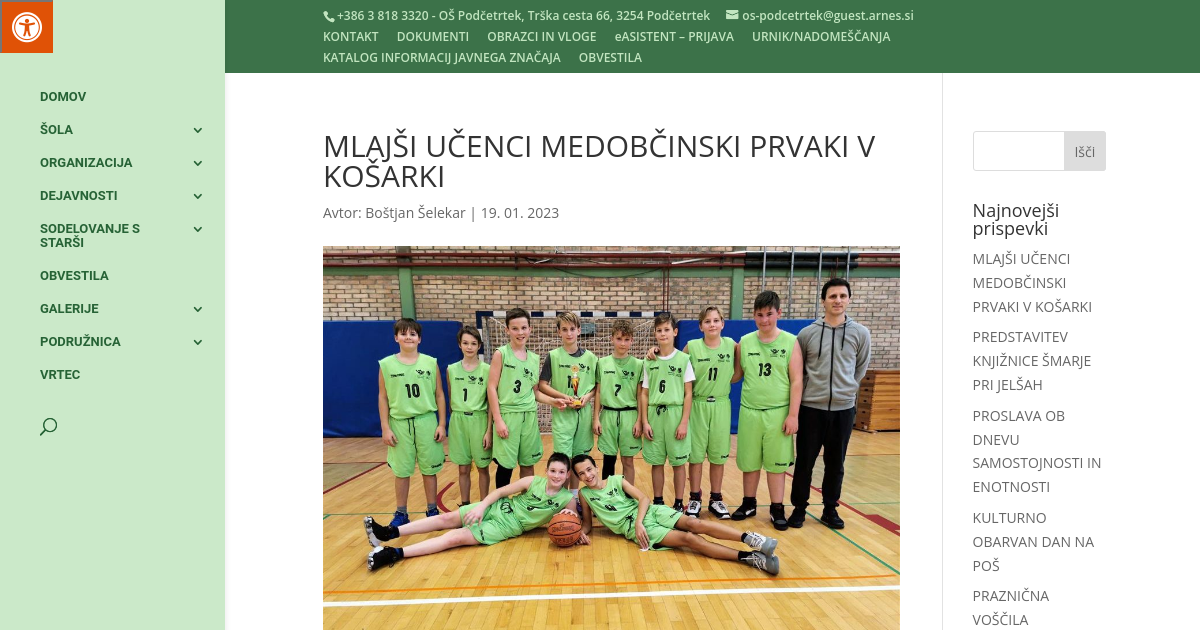 Tokratno medobčinsko tekmovanje v košarki za mlajše učence smo gostili na naši šoli. Prijavile so se štiri ekipe, prvi dve mesti pa sta vodili na področno tekmovanje. V uvodnem dvoboju sta si nasproti stali ekipi OŠ Šmarje pri Jelšah in igralci naše šole. Po izenačenih uvodnih dveh tretjinah so v zaključku naši košarkarji pokazali malce več in slavili s 27:23. Ker je II. OŠ Rogaška Slatina po podaljšku ugnala I. OŠ Rogaška Slatina je bilo jasno, da bodo naši šolarji pot na področno tekmovanje iskali v dvoboju s I. OŠ Rogaška Slatina. V odločilni tekmi so mladi Podčetrtčani pokazali veliko več kot v prvi tekmi in zanesljivo slavili z 48:25. S končnim prvim mestom so si priigrali tudi uvrstitev na področno tekmovanje. Čestitke!