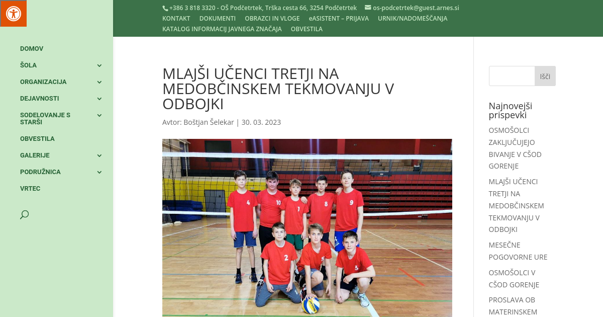 Letošnji turnir v odbojki za mlajše učence je potekal na OŠ Rogatec. Poleg domačih fantov so na turnirju nastopili še šolarji OŠ Šmarje pri Jelšah, I. OŠ Rogaška Slatina in odbojkarji naše šole. Turnir je potekal v prijetnem vzdušju, kjer so bile prav vse tekme zelo izenačene. Naši učenci so bili na tokratnem turnirju z 2:1 boljši od I. OŠ Rogaška Slatina, a zabeležili tudi dva zelo tesna poraza z 2:1 proti OŠ Šmarje pri Jelšah in OŠ Rogatec, kar jim je na koncu prineslo uvrstitev na tretje mesto.