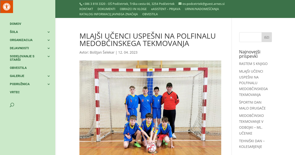 Na letošnjem prvem polfinalnem turnirju medobčinskega tekmovanja v nogometu so natopili tudi naši učenci. Turnir je potekal na OŠ Šmarje pri Jelšah in za uvod so se naši fantje pomerili z domačini. V izenačenem srečanju je nekoliko več pokazala naša ekipa in zmagala z rezultatom 1:0. Tudi v drugo so bili naši nogometaši uspešni, saj so prav tako z 1:0 ugnali I. OŠ Rogaška Slatina in si s tem priigrali nastop na finalnem turnirju medobčinskega tekmovanja.