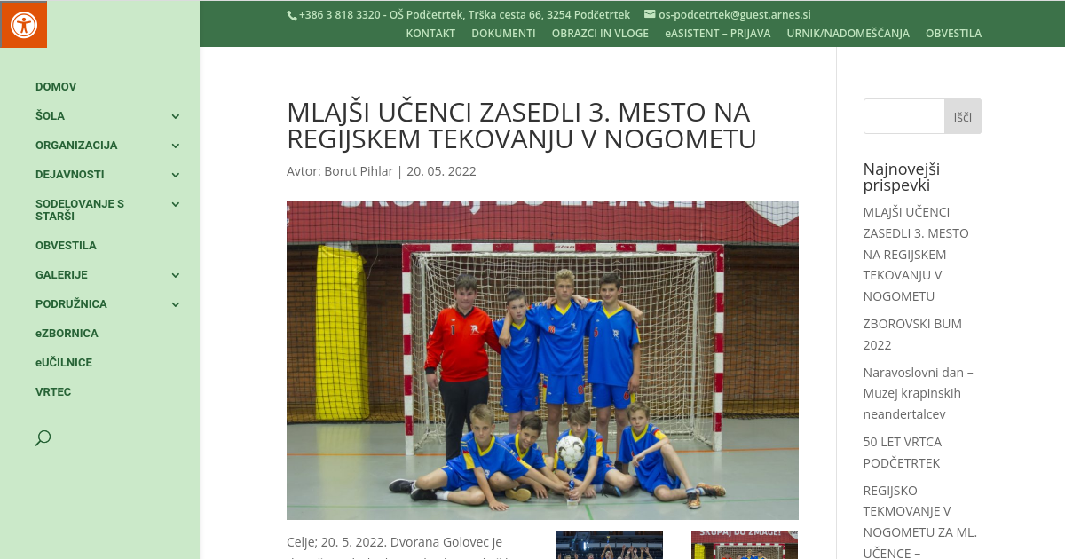 Celje; 20. 5. 2022. Dvorana Golovec je drugič v treh dneh gostila ekipe mlajših učencev v nogometu. Na zaključni turnir štirih najboljših ekip so se poleg naše ekipe, uvrstile še ekipe OŠ Štore, OŠ Vojnik in OŠ Slovenske Konjice. Na prvi tekmi so se naši igralci pomerili z vrstniki iz Slovenskih Konjic, kljub številnim priložnostim naša žoga ni našla poti v nasprotnikov gol in tekma se je končala z izidom 0:0. Kot se je izkazalo kasneje, bi že en zadetek naših na tej tekmi, pomenil prvo mesto na turnirju. Naš drugi nasprotnik je bila ekipa Vojnika. Naši so gladko zmagali z rezultatom 5:0, takoj zatem pa se pomerili še z ekipo iz OŠ Štore in ob nekoliko slabši igri in tudi že utrujenosti izgubili z 3:1. Tako so zasedli končno 3. mesto. Ekipo so sestavljali: Lovro Bah Nenadič, Rok Šelekar, David Jereb (kapetan), Tilen Boršič, Gal Zakošek, Tjan Jagrič, Aljaž Čokelc in Žiga Sovinc. Čestitke