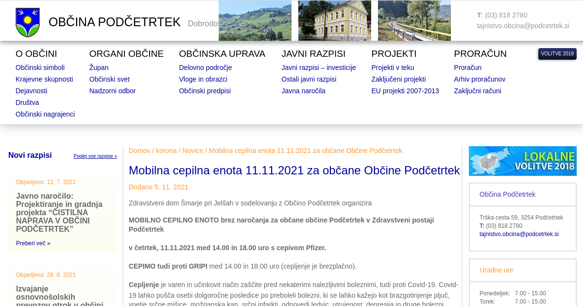 Zdravstveni dom Šmarje pri Jelšah v sodelovanju z Občino Podčetrtek organizira MOBILNO CEPILNO ENOTO brez naročanja za občane občine Podčetrtek v Zdravstveni postaji Podčetrtek v četrtek, 11.11.2021 med 14.00 in 18.00 uro s cepivom Pfizer. CEPIMO tudi proti GRIPI med 14.00 in 18.00 uro (cepljenje je brezplačno). Cepljenje je varen in učinkovit način zaščite pred nekaterimi nalezljivimi boleznimi, tudi proti Covid-19.