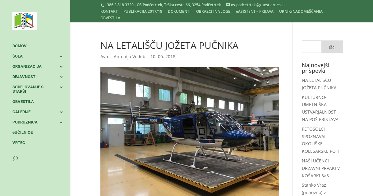 Učenci petih razredov so bili tudi letos vključeni v projekt Policist Leon svetuje, kjer so se seznanili z nevarnostmi v vsakdanjem življenju in iskali so primerne rešitve za reševanje različnih težav. Ob zaključku projekta so odšli na ogled letališča Jožeta Pučnika. Ogledali so si helikoptersko enoto policije in njeno delovanje, letališče. Posebna zahvala policistu PP Šmarje pri Jelšah g. Marku Krču za organizacijo ter občini Podčetrtek za finančno podporo avtobusnega prevoza. Bilo je poučno in lepo. Fotografije: David Ivačič
