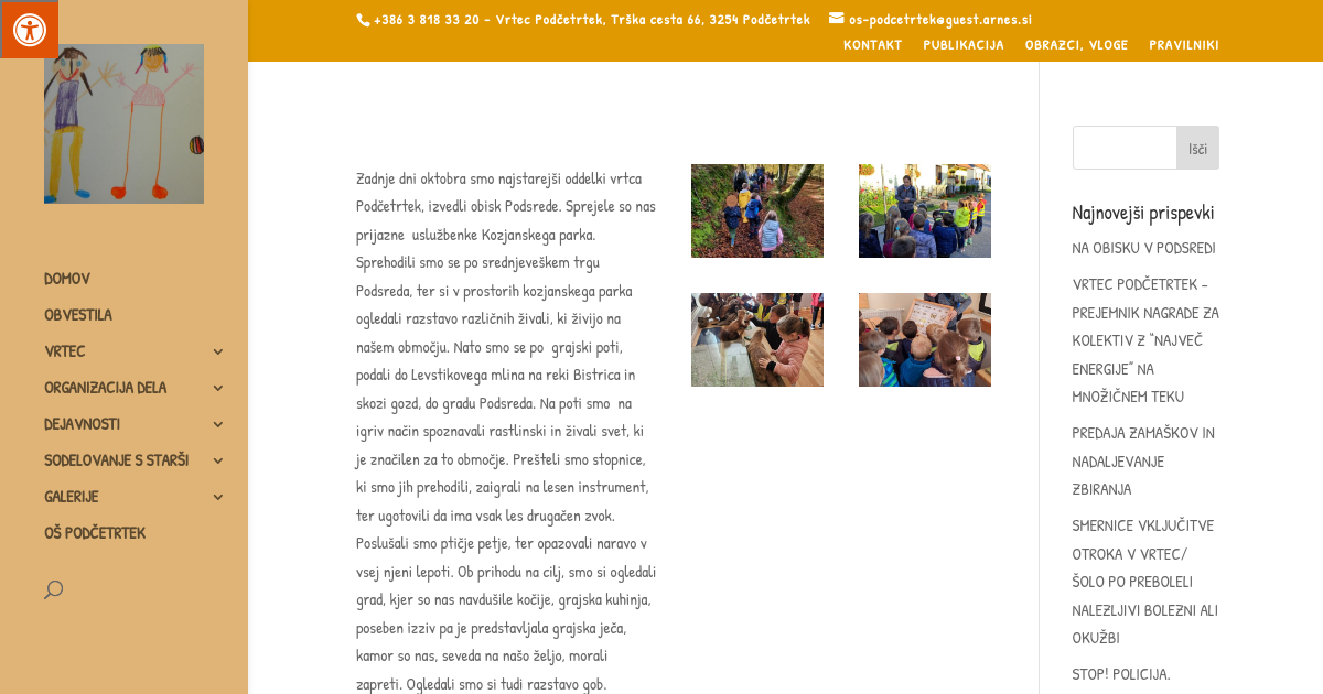Zadnje dni oktobra smo najstarejši oddelki vrtca Podčetrtek, izvedli obisk Podsrede. Sprejele so nas prijazne uslužbenke Kozjanskega parka. Sprehodili smo se po srednjeveškem trgu Podsreda, ter si v prostorih kozjanskega parka ogledali razstavo različnih živali, ki živijo na našem območju. Nato smo se po grajski poti, podali do Levstikovega mlina na reki Bistrica in skozi gozd, do gradu Podsreda. Na poti smo na igriv način spoznavali rastlinski in živali svet, ki je značilen za to območje. Prešteli smo stopnice, ki smo jih prehodili, zaigrali na lesen instrument, ter ugotovili da ima vsak les drugačen zvok. Poslušali smo ptičje petje, ter opazovali naravo v vsej njeni lepoti. Ob prihodu na cilj, smo si ogledali grad, kjer so nas navdušile kočije, grajska kuhinja, poseben izziv pa je predstavljala grajska ječa, kamor so nas, seveda na našo željo, morali zapreti. Ogledali smo si tudi razstavo gob.