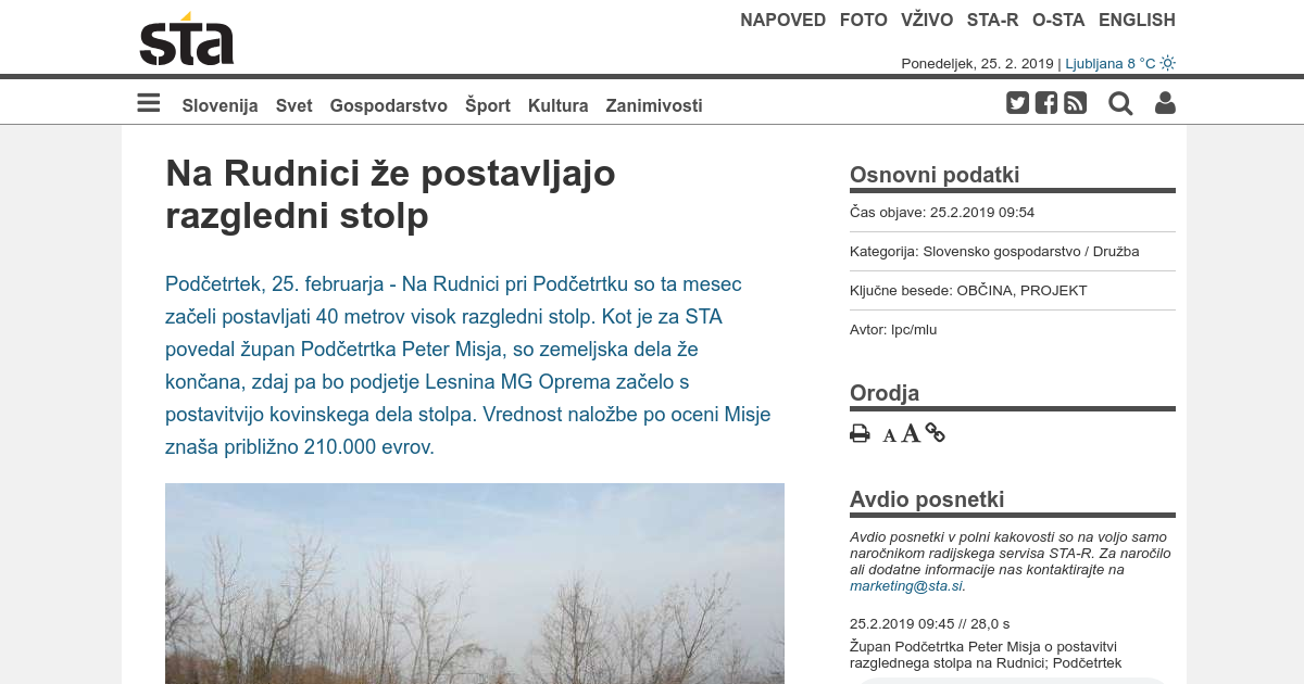 Na Rudnici pri Podčetrtku so ta mesec začeli postavljati 40 metrov visok razgledni stolp. Kot je za STA povedal župan Podčetrtka Peter Misja, so zemeljska dela že končana, zdaj pa bo podjetje Lesnina MG Oprema začelo s postavitvijo kovinskega dela stolpa. Vrednost naložbe po oceni Misje znaša približno 210.000 evrov.