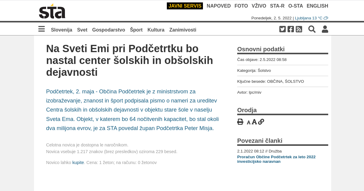 Občina Podčetrtek je z ministrstvom za izobraževanje, znanost in šport podpisala pismo o nameri za ureditev Centra šolskih in obšolskih dejavnosti v objektu stare šole v naselju Sveta Ema. Objekt, v katerem bo 64 nočitvenih kapacitet, bo stal okoli dva milijona evrov, je za STA povedal župan Podčetrtka Peter Misja.