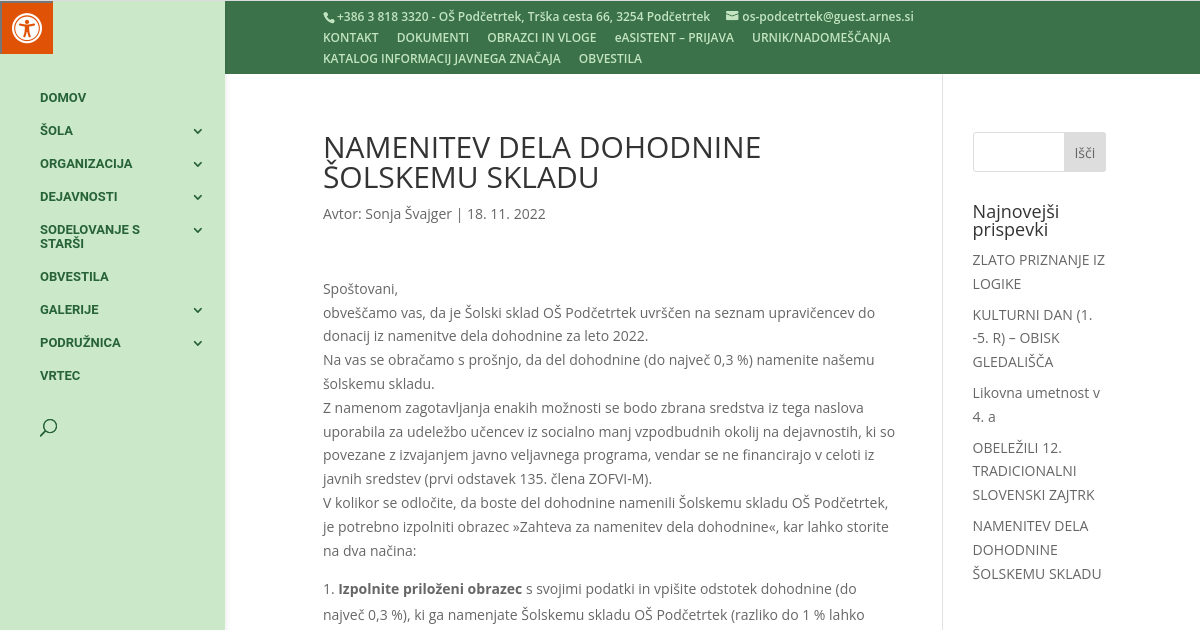 Spoštovani, obveščamo vas, da je Šolski sklad OŠ Podčetrtek uvrščen na seznam upravičencev do donacij iz namenitve dela dohodnine za leto 2022. Na vas se obračamo s prošnjo, da del dohodnine (do največ 0,3 %) namenite našemu šolskemu skladu. Z namenom zagotavljanja enakih možnosti se bodo zbrana sredstva iz tega naslova uporabila za udeležbo učencev iz socialno manj vzpodbudnih okolij na dejavnostih, ki so povezane z izvajanjem javno veljavnega programa, vendar se ne financirajo v celoti iz javnih sredstev (prvi odstavek 135. člena ZOFVI-M). V kolikor se odločite, da boste del dohodnine namenili Šolskemu skladu OŠ Podčetrtek, je potrebno izpolniti obrazec »Zahteva za namenitev dela dohodnine«, kar lahko storite na dva načina: