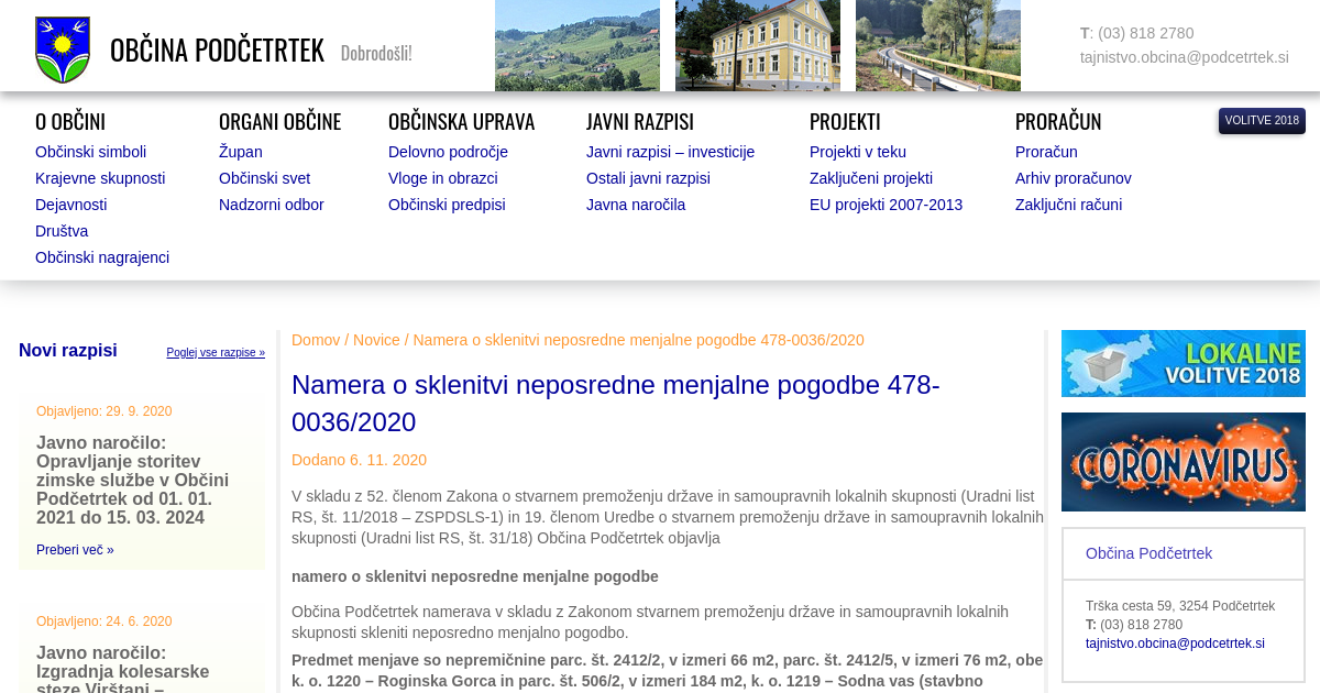 V skladu z 52. členom Zakona o stvarnem premoženju države in samoupravnih lokalnih skupnosti (Uradni list RS, št. 11/2018 – ZSPDSLS-1) in 19. členom Uredbe o stvarnem premoženju države in samoupravnih lokalnih skupnosti (Uradni list RS, št. 31/18) Občina Podčetrtek objavlja namero o sklenitvi neposredne menjalne pogodbe Občina Podčetrtek namerava v skladu z Zakonom stvarnem