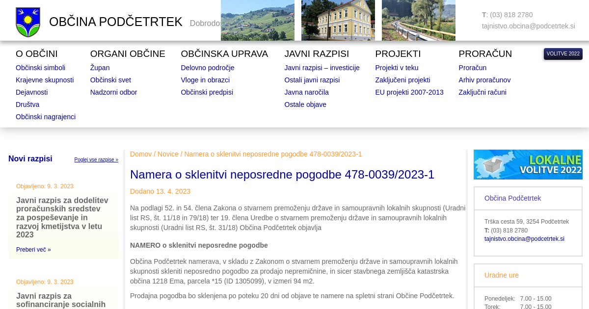 Na podlagi 52. in 54. člena Zakona o stvarnem premoženju države in samoupravnih lokalnih skupnosti (Uradni list RS, št. 11/18 in 79/18) ter 19. člena Uredbe o stvarnem premoženju države in samoupravnih lokalnih skupnosti (Uradni list RS, št. 31/18) Občina Podčetrtek objavlja NAMERO o sklenitvi neposredne pogodbe Občina Podčetrtek namerava, v skladu z Zakonom o