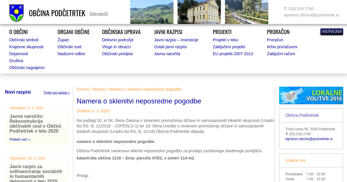 Na podlagi 52. in 54. člena Zakona o stvarnem premoženju države in samoupravnih lokalnih skupnosti (Uradni list RS, št. 11/2018 – ZSPDSLS-1) ter 19. člena Uredbe o stvarnem premoženju države in samoupravnih lokalnih skupnosti (Uradni list RS, št. 31/18) Občina Podčetrtek objavlja namero o sklenitvi neposredne pogodbe. Občina Podčetrtek namerava skleniti neposredno pogodbo za prodajo