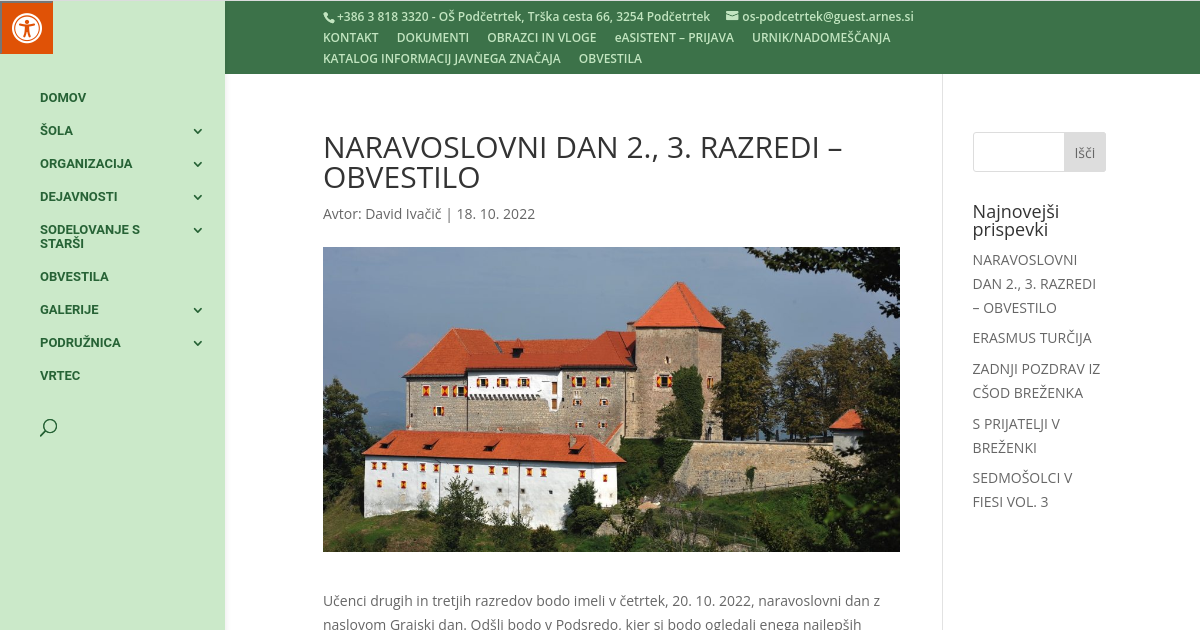 Učenci drugih in tretjih razredov bodo imeli v četrtek, 20. 10. 2022, naravoslovni dan z naslovom Grajski dan. Odšli bodo v Podsredo, kjer si bodo ogledali enega najlepših gradov v Sloveniji. Pravijo mu tudi »najbolj grajski med gradovi na Slovenskem« – Grad Podsreda. Udeležili se bodo tematskih delavnic in spoznavali grajsko življenje, zelišča, oblačilno kulturo, srednjeveško glasbo, prehranjevalne in življenjske razmere v srednjem veku.