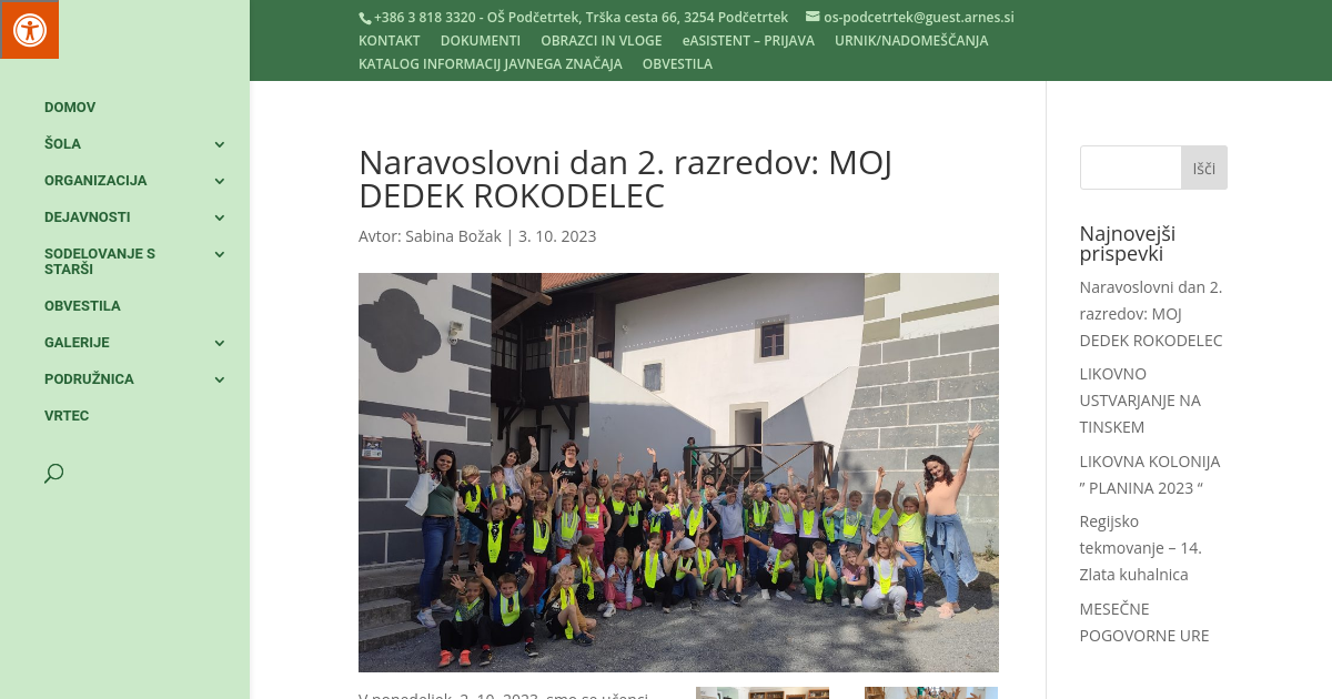 V ponedeljek, 2. 10. 2023, smo se učenci 2. razredov ob spremstvu učiteljic odpravili v Rogatec na Dvorec Strmol, kjer smo izvedli prvi naravoslovni dan z naslovom Moj dedek rokodelec. Ob prihodu smo najprej malicali, potem pa se kaj hitro lotili ročnega ustvarjanja. Razdeljeni v tri skupine smo obiskali in izkusili vsako iz med delavnic. Tako smo se preizkusili v oblikovanju magnetka iz gline, slikanju na steklo in pletenju zapestnic iz ličja. Pri slednji smo ugotovili, da pletenje kite prav zares ni tako enostavno in bo potrebno še kar nekaj vaje. Po končanih delavnicah je ponovno sledil kratek odmor, potem pa še zanimiv ogled dvorca. Na dvorcu nas je čakalo presenečenje, ki ga zares nismo pričakovali – pozdravila nas je operna pevka, ga. Natalija Hormuth in nam z veseljem zapela dve operni skladbici, nad katerima smo bili naravnost navdušeni. V zahvalo smo ji tudi mi zapeli pesem, ki jo znamo vsi skupaj – Lisička je prav zvita zver. Polni lepih vtisov, novih doživetij in s svojimi izdelki smo se vrnili nazaj v šolo.