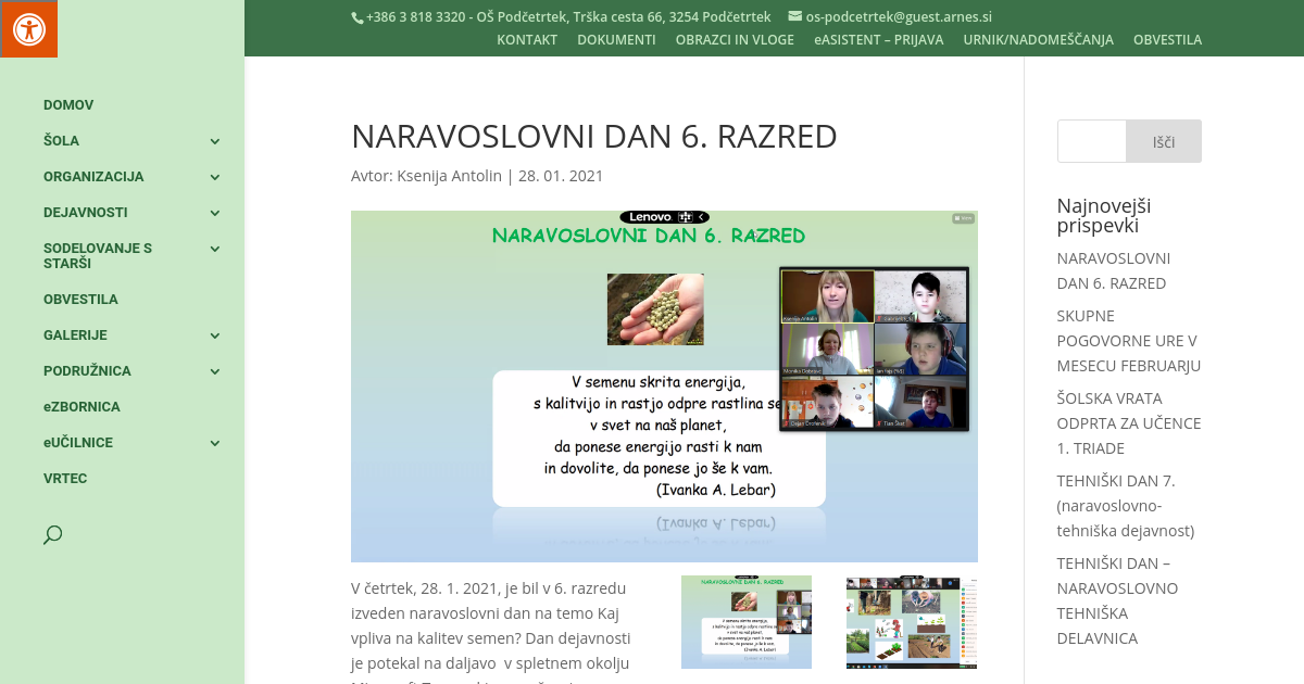 V četrtek, 28. 1. 2021, je bil v 6. razredu izveden naravoslovni dan na temo Kaj vpliva na kalitev semen? Dan dejavnosti je potekal na daljavo v spletnem okolju Microsoft Teams, kjer so učenci v skupinah načrtovali in izvedli poskuse kalitve semen pod različnimi pogoji in rezultate podali v skupnem spletnem dokumentu Raziskovalna naloga.