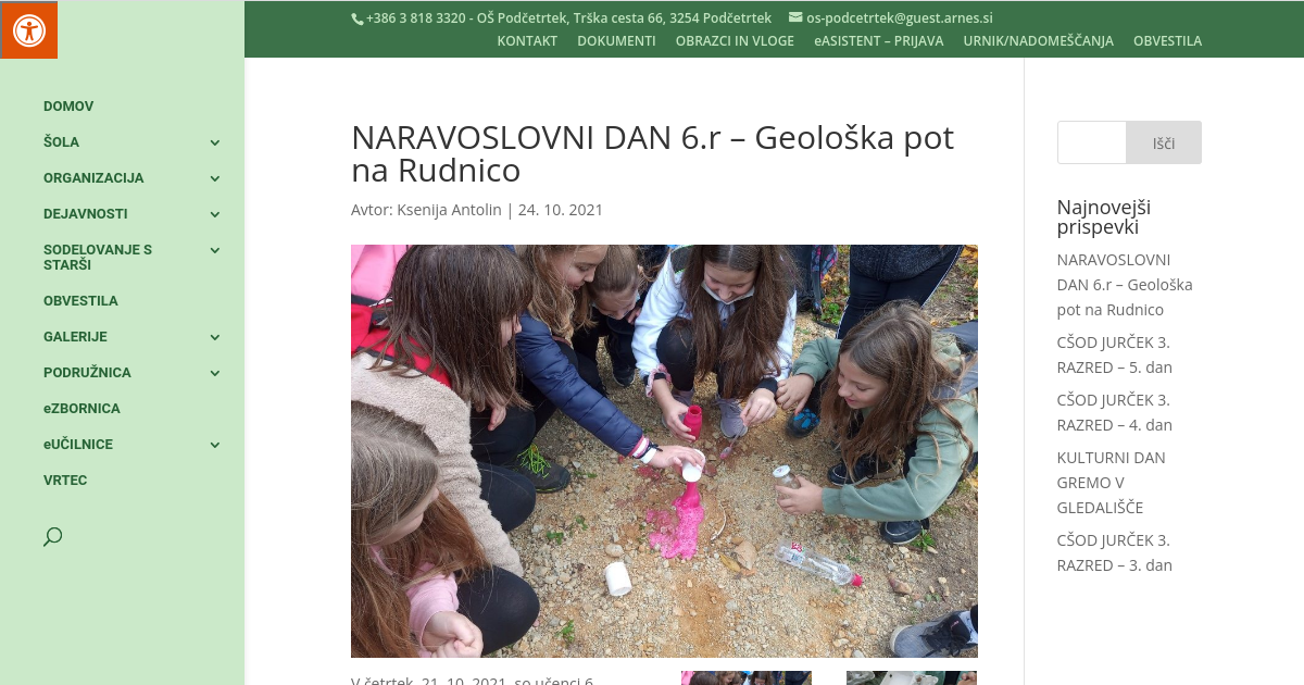 V četrtek, 21. 10. 2021, so učenci 6. razredov prehodili geološko učno pot, ki poteka v okolici Olimja. Strokovni delavki iz Kozjanskega parka sta učence seznanili z različnimi kamninami, njihovo sestavo in starostjo. Učenci so obiskali opuščen rudnik železa, si ogledovali kristale mineralov in izdelali »vulkan«.