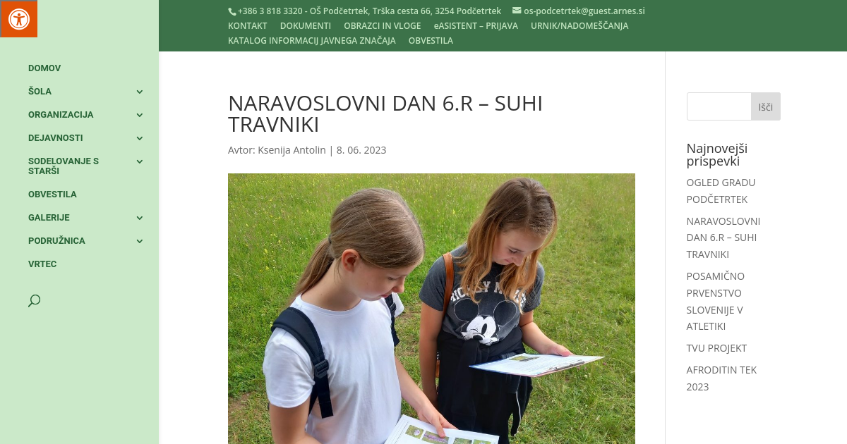 V četrtek, 8. 6. 2023, je bil v 6. razredu izveden naravoslovni dan na temo Suhi travniki. Dan dejavnosti je potekal na Vetrniku, kjer so učenci pod okriljem strokovnih delavk Kozjanskega parka raziskovali številne zaščitene vrste rastlin, predvsem iz družine kukavičevk ali orhidej.