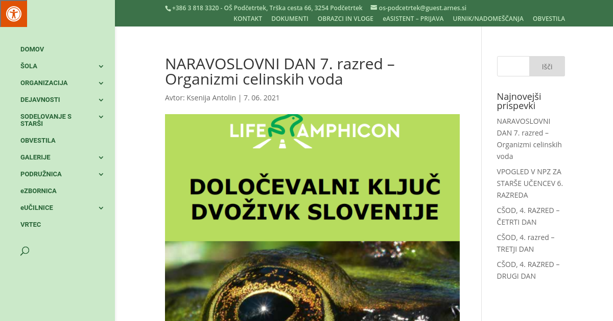 V petek, 4. 6. 2021, je bil v 7. razredu izveden naravoslovni dan na temo Organizmi celinskih voda. Dan dejavnosti je potekal na daljavo v spletnem okolju Microsoft Teams, kjer so si učenci ogledali dokumentarni film, se preizkusili v različnih kvizih, poimenovali so organizme s pomočjo določevalnih ključev in slednjega tudi samostojno izdelali.