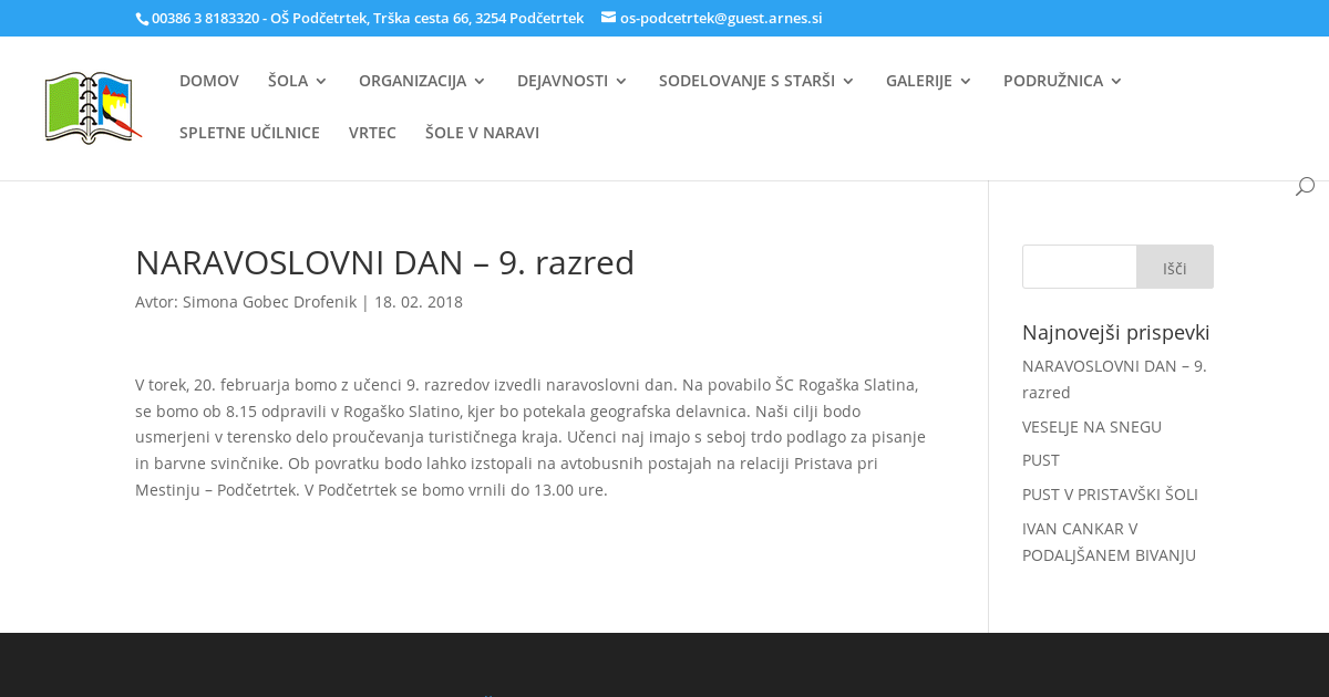 V torek, 20. februarja bomo z učenci 9. razredov izvedli naravoslovni dan. Na povabilo ŠC Rogaška Slatina, se bomo ob 8.15 odpravili v Rogaško Slatino, kjer bo potekala geografska delavnica. Naši cilji bodo usmerjeni v terensko delo proučevanja turističnega kraja. Učenci naj imajo s seboj trdo podlago za pisanje in barvne svinčnike. Ob povratku bodo lahko izstopali na avtobusnih postajah na relaciji Pristava pri Mestinju – Podčetrtek. V Podčetrtek se bomo vrnili do 13.00 ure.