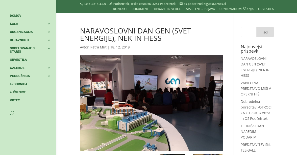 Osnovnošolci in osnovnošolke ter posamezni učitelji 9.a in 9.b razreda smo imeli 17. 12. 2019 naravoslovni dan. Najprej smo se odpravili v hidroelektrarno Brežice. Tam smo si ogledali njeno delovanje, akumulacijsko jezero ter kontrolno sobo, kjer smo videli tudi delovanje drugih hidroelektrarn na spodnji Savi. Nato smo se odpravili v GEN energijo v Krškem, kjer smo si ogledali delovanje jedrske elektrarne in opravili zanimive poskuse z elektriko. V enem poskusu smo jo celo začutili. Videli smo tudi plazmo in eksplozijo bakra, ki je bila zelo glasna. Na koncu smo si bližje, na varnem iz avtobusa, ogledali našo edino jedrsko elektrarno Nuklearno elektrarno Krško. Proti šoli smo med vožnjo videli še hidroelektrarno Krško in termoelektrarno Brestanica.