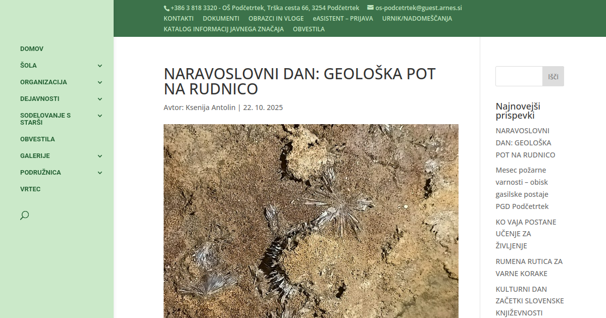 V sredo, 22. 10. 2025, so učenci 6. razredov prehodili geološko učno pot, ki poteka v okolici Olimja. Strokovni delavki iz Kozjanskega parka sta učence seznanili z različnimi kamninami, njihovo sestavo in starostjo. Učenci so si izdelali lastno zbirko kamnin, obiskali opuščen rudnik železa, si ogledovali kristale mineralov in izdelali »vulkan«.