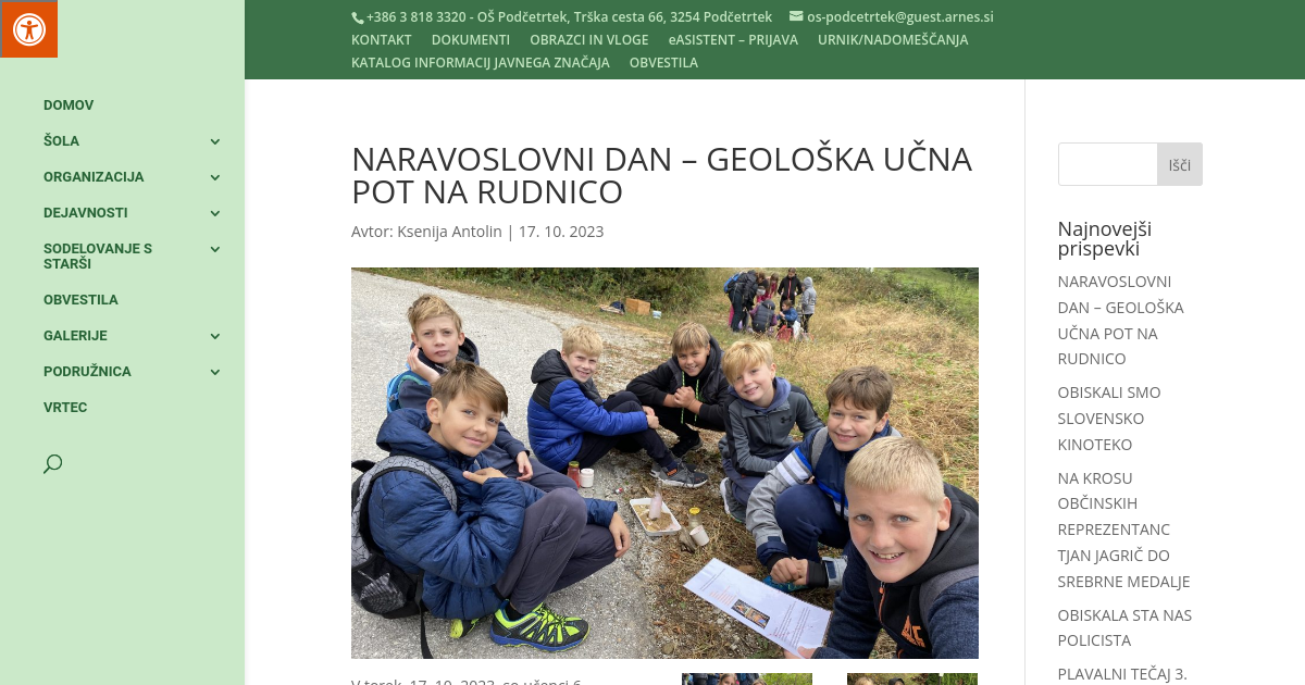V torek, 17. 10. 2023, so učenci 6. razredov prehodili geološko učno pot, ki poteka v okolici Olimja. Strokovni delavki iz Kozjanskega parka sta učence seznanili z različnimi kamninami, njihovo sestavo in starostjo. Učenci so obiskali opuščen rudnik železa, si ogledovali kristale mineralov in izdelali »vulkan«.