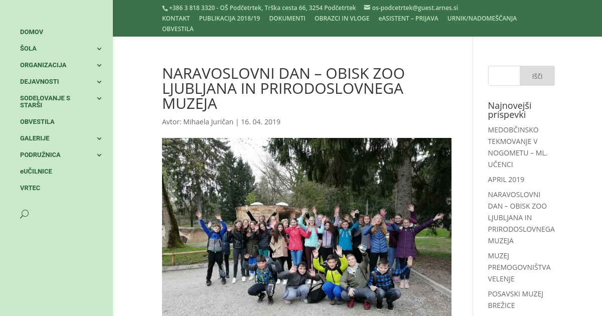 V petek, 12. aprila 2019, smo se že zgodaj zjutraj odpravili v Ljubljano, kjer smo najprej obiskali živalski vrt nato pa še Prirodoslovni muzej. Pot do Ljubljane je hitro minila. V živalskem vrtu nam je vodička podrobneje predstavila kače in kuščarje, ki smo ju lahko tudi pobožali. Med krajšim sprehodom in ogledom živali nam je povedala še nekaj zanimivosti o opicah in medvedih. Dobili smo tudi priložnost, da si ogledamo hranjenje tjulnjev. Prosti čas smo nato učenci sami izkoristili še za ogled nekaterih drugih živalskih vrst.