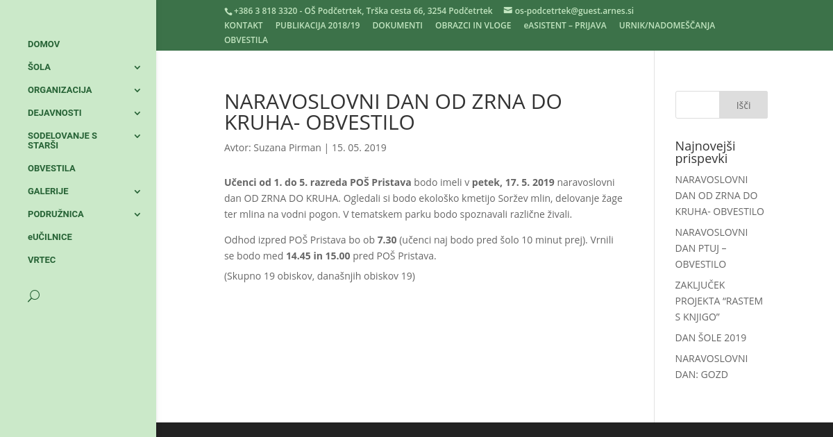 Učenci od 1. do 5. razreda POŠ Pristava bodo imeli v petek, 17. 5. 2019 naravoslovni dan OD ZRNA DO KRUHA. Ogledali si bodo ekološko kmetijo Soržev mlin, delovanje žage ter mlina na vodni pogon. V tematskem parku bodo spoznavali različne živali.