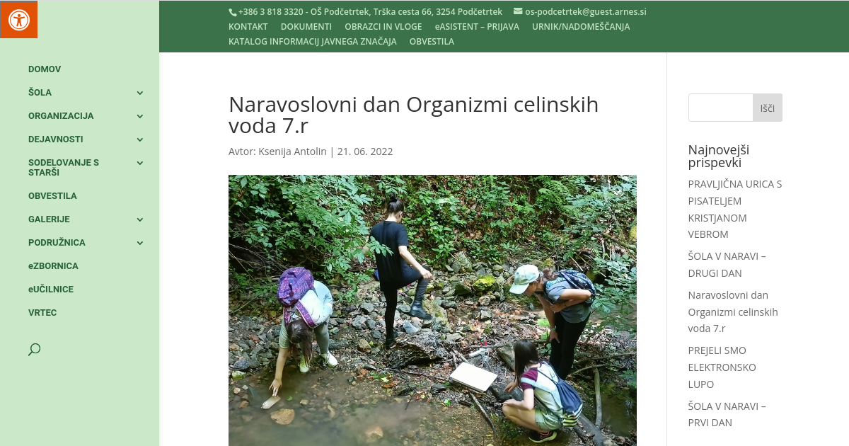 V torek, 21. 6. 2022, je potekal naravoslovni dan za učence 7. razreda na temo Organizmi celinskih voda. Raziskovali smo živali v gozdnem potoku ter usvojili tehniko mikroskopiranja, ko smo opazovali organizme, ujete v bližnjem ribniku.