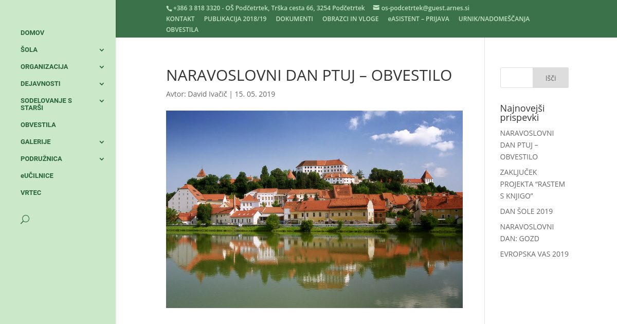 Učenci od 1. do 4. razreda MOŠ Podčetrtek bodo imeli v ponedeljek, 20. 5. 2019 naravoslovni dan. Ogledali si bomo PTUJSKI GRAD IN STARO MESTNO JEDRO. Odhod izpred šole bo ob 7.30. Vrnitev v šolo bo ob 13.00.