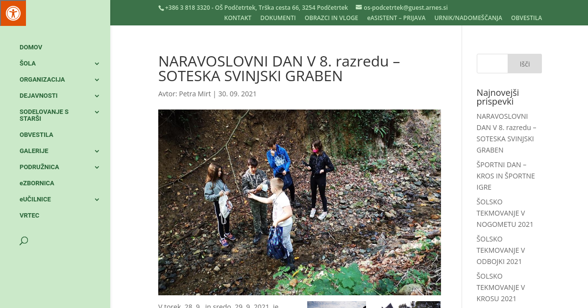 V torek, 28. 9., in sredo, 29. 9. 2021, je potekal naravoslovni dan za učence 8. razreda na temo merjenja v naravi. V ta namen so merili razdalje v naravi le z uporabo geotrikotnika in svojega koraka. Ugotavljali so zakonitosti pri padanju in se urili v merjenju časa. Raziskali so tudi hitrost in pretok vodnega toka bližnjega potoka v soteski Svinjski graben. Od postaje do postaje so učenci med hojo opazovali naravo, našli tudi potočnega raka in tako aktivno ter učinkovito preživeli dan dejavnosti.