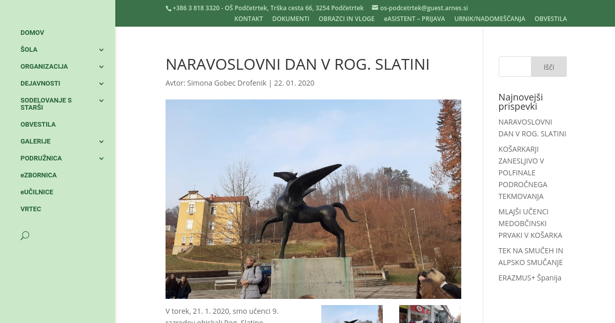 V torek, 21. 1. 2020, smo učenci 9. razredov obiskali Rog. Slatino. Kljub temu da nam je Rog. Slatina precej blizu, o njej mnogi ne vedo kaj dosti povedati. To lahko potrdiva tudi midve, saj sva ob obisku vseh znamenitosti izvedeli kar nekaj novih stvari. Naravoslovni dan smo pričeli na Pegazovi ploščadi, kjer smo bili seznanjeni z legendo o nastanku mineralne vode. Za tem smo se sprehodili skozi park in opazovali tamkajšnje najstarejše zgradbe. Potep smo zaključili z obiskom Aninega dvora in knjižnice, kjer so nam predstavili njihovo najstarejšo zbirko knjig.