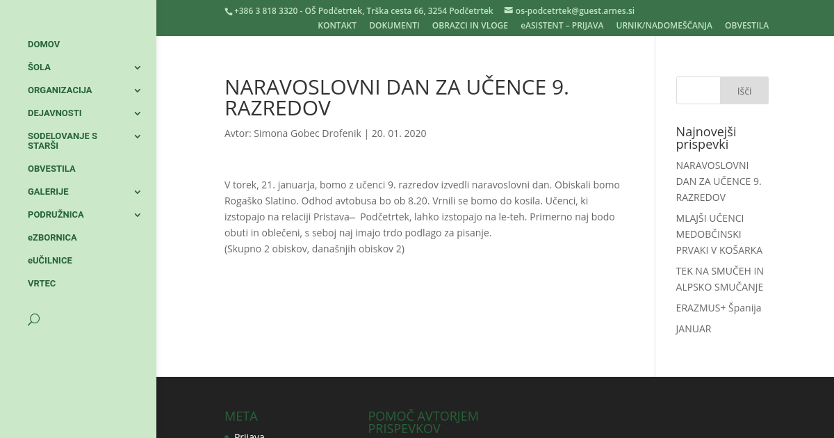 V torek, 21. januarja, bomo z učenci 9. razredov izvedli naravoslovni dan. Obiskali bomo Rogaško Slatino. Odhod avtobusa bo ob 8.20. Vrnili se bomo do kosila. Učenci, ki izstopajo na relaciji Pristava ̶ Podčetrtek, lahko izstopajo na le-teh. Primerno naj bodo obuti in oblečeni, s seboj naj imajo trdo podlago za pisanje.