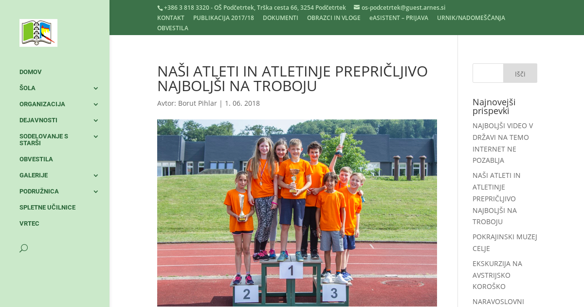 V četrtek 31. maja 2018 je na atletskem stadionu v Rogaški Slatini potekalo medobčinsko tekmovanje v atletskem troboju za učence in učenke 4. in 5. razreda. Mladi atleti so se pomerili v teku na 60m, skoku v daljino in metu vortexa. Naša osemčlanska ekipa je bila prepričljivo najboljša, saj so tako fantje kot dekleta osvojili ekipno prvo mesto in bili tudi skupni ekipni zmagovalci. Tudi pri posameznikih so osvojili tri kolajne, Jaka Jančič in Luna Lorger sta prejela srebrni medalji, Makalonca Bovha pa bronasto.