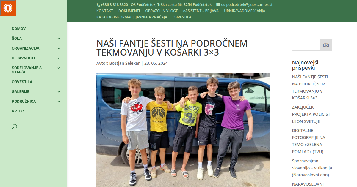 V sredo, 22. 5., je bilo v športni dvorani OŠ Šoštanj organizirano področno tekmovanje v košarki 3×3. Naša šola se je turnirja udeležila z ekipo starejših učencev. Skupinski del tekmovanja so naši učenci opravili dobro in se kot drugo uvrščena ekipa prebili v naslednji krog tekmovanja. Fantje so nato s 13:5 premagali OŠ Hruševec, za preboj med osem najboljših ekip pa bili s 13:9 boljši še od OŠ Petrovče. Sledila je tekma, ki je prinašala uvrstitev v polfinale. V napetem obračunu so o zmagovalcu odločali podaljški, kjer so nekoliko več pokazali učenci OŠ Primoža Trubarja Laško in slavili s 16:13. Naši košarkarji so tako tekmovanje zaključili na šestem mestu, kar je lep rezultat ob dejstvu, da je na turnirju nastopalo 32 ekip iz regije.