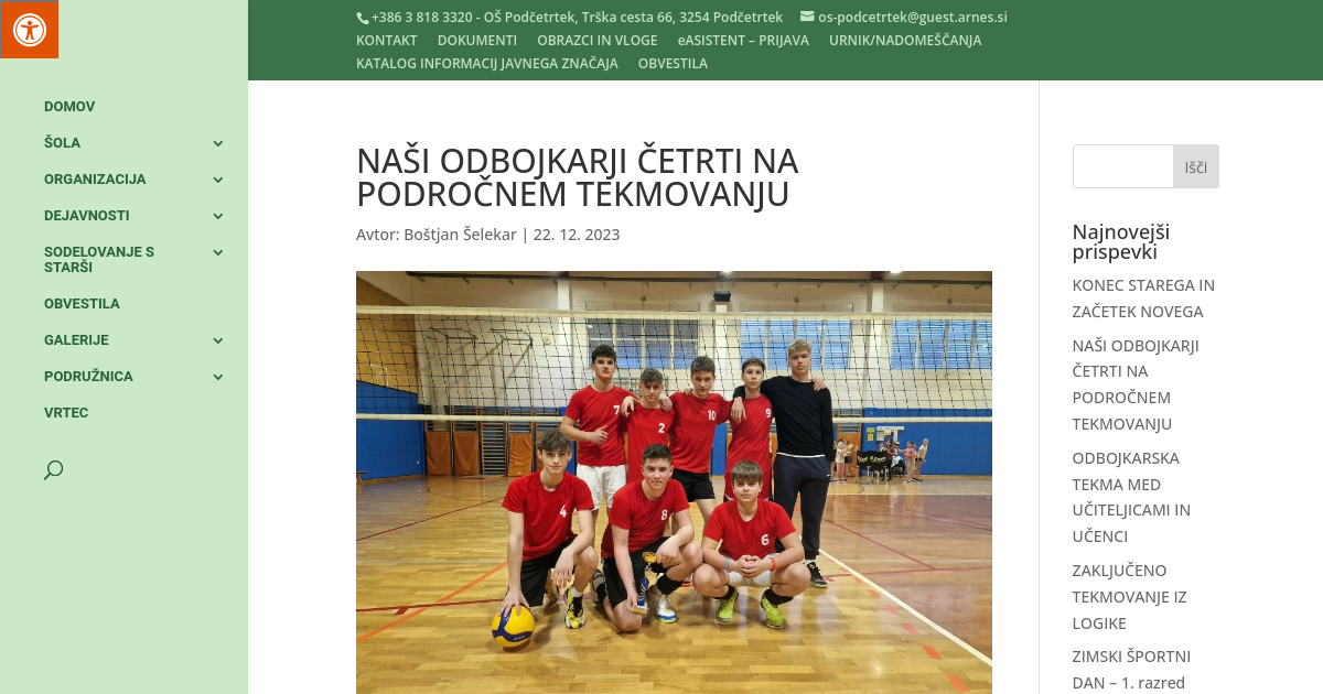 Odbojkarska ekipa starejših učencev se je po zmagi na medobčinskem tekmovanju uvrstila na finale področnega tekmovanja celjske regije. Turnir je potekal na OŠ Braslovče, kjer se je zbralo osem najboljših ekip z regije. Naši učenci so v prvi tekmi po napeti končnici premagali OŠ Vojnik z rezultatom 2:1. Tudi v drugem srečanju so bili uspešni in zanesljivo ugnali vrstnike iz OŠ Loče s končnih 2:0. Z dvema zmagama v skupini so se uvrstili v polfinale, kjer so jim nasproti stali učenci OŠ Šempeter. Šoli OŠ Šempeter in OŠ Braslovče sta šoli, ki imata v odbojki bogato tradicijo in se redno uvrščata med najboljše ekipe v državi, saj v obeh krajih uspešno delujeta tudi odbojkarska kluba. Toda naši fantje se niso ustrašili izziva in po odlični igri osvojili prvi niz. Tudi v drugem nizu so že vodili s 15:10 in bili na pragu presenetljive zmage, a žal je bilo v zaključku niza z naše strani nekaj nepotrebnih napak, kar so nasprotniki izkoristili in izid izenačili na 1:1. V odločilnem nizu je bilo zopet napeto. Naši fantje so se borili do konca, a so bili učenci OŠ Šempeter na koncu vendarle nekoliko uspešnejši in se uvrstili v finale. Sledila je tekma za tretje mesto, kjer smo zopet spremljali zelo izenačen dvoboj naših odbojkarjev, ki so jim nasproti stali učenci iz OŠ Laško. V končnicah obeh setov so nasprotniki pokazali nekaj malega več in naši fantje so tekmovanje zaključili kot četrta ekipa v regiji, kar je lep uspeh za to generacijo, ki je v ta rezultat vložila kar nekaj dodatnih ur vadbe. Čestitke ekipa!