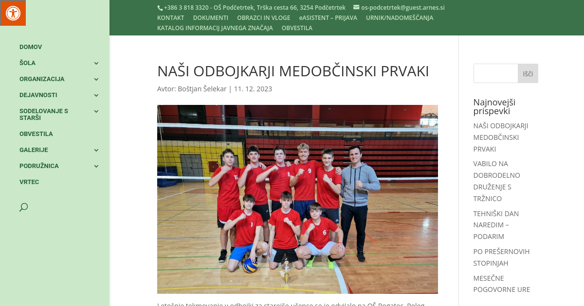 Letošnje tekmovanje v odbojki za starejše učence se je odvijalo na OŠ Rogatec. Poleg šole gostiteljice so na turnirju nastopili še učenci OŠ Šmarja pri Jelšah, I. OŠ Rogaška Slatina in fantje naše šole. Za uvod je naša ekipa brez težav ugnala vrstnike iz I. OŠ Rogaška Slatina. V drugem srečanju so nato naši devetošolci v dveh napetih nizih morali priznati premoč odbojkarjem Rogatca, a nekoliko slabšo igro z druge tekme hitro popravili in v zadnjem srečanju z 2:0 ugnali še šolarje OŠ Šmarje pri Jelšah. Vse to je na koncu bilo dovolj za prvo mesto, ki prinaša tudi uvrstitev na regijsko tekmovanje.