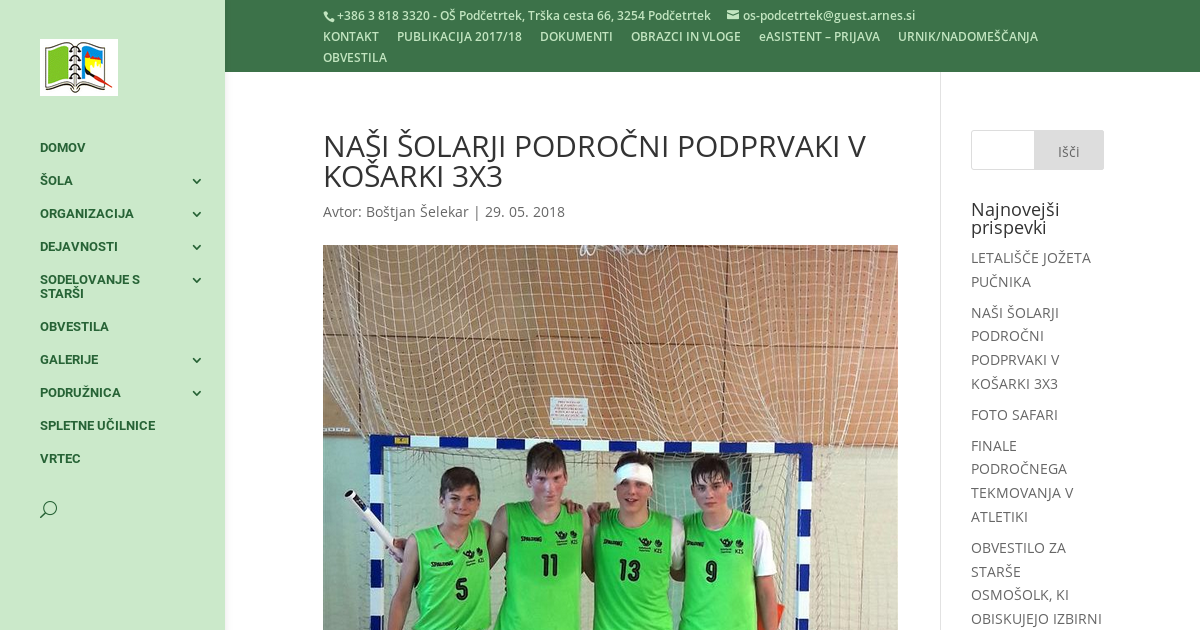 Na IV. OŠ Celje je potekala premierna izvedba področnega šolskega tekmovanja v košarki 3×3. Potem ko je bil ta šport sprejet med olimpijske je seveda tudi zanimanje zanj v porastu, KZS pa se je odločila tudi za šolsko izvedbo tega tekmovanja. Tekmovanja se je udeležilo 22 fantovskih ekip, ki so bile razdeljene v sedem skupin. Naša ekipa v skupinskem delu ni imela večjih težav in se zanesljivo uvrstila v izločilne boje. Tudi tam so naši fantje vse do finala premagovali tekmece z visoko razliko. V finalu so bili nasprotniki košarkarji OŠ Kajetana Koviča Poljčane. Ob lepem vodstvu naše ekipe se je žal poškodoval naš najboljši strelec Gašper Škorjanc, kar so nasprotniki v nadaljevanju tekme izkoristili in na koncu tesno slavili s 12:11. S končnim drugim mestom so se naši fantje uvrstili na finale DP 3×3, ki bo 6. 6. v okviru Festivala športa v Žalcu. Čestitke!