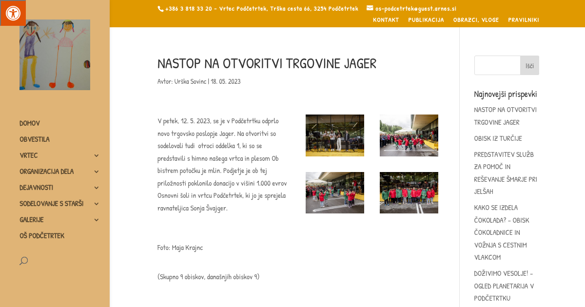 V petek, 12. 5. 2023, se je v Podčetrtku odprlo novo trgovsko poslopje Jager. Na otvoritvi so sodelovali tudi otroci oddelka 1, ki so se predstavili s himno našega vrtca in plesom Ob bistrem potočku je mlin. Podjetje je ob tej priložnosti poklonilo donacijo v višini 1.000 evrov Osnovni šoli in vrtcu Podčetrtek, ki jo je sprejela ravnateljica Sonja Švajger.