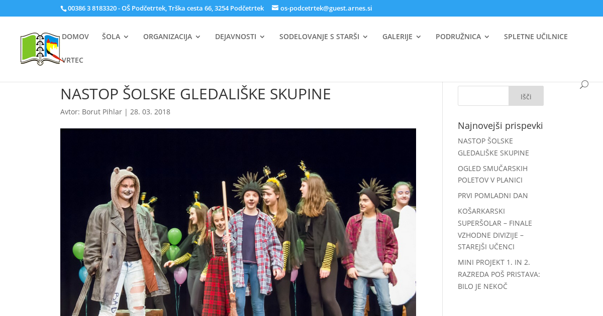 V OŠ Podčetrtek dramska skupina deluje več let. Uspešno smo se predstavili z nekaj predstavami: Obtoženi volk, Kralj v časopisu, Pavliha noče v šolo, Nenavadna poroka, Gor na strehi sedi muha, Plesoči osliček, Vila Malina, Smradek … V šolskem letu 2017/18 so združili moči učenci, ki obiskujejo dramski krožek in izbirni predmet gledališki klub ter pripravili gledališko uprizoritev pravljice Svetlane Makarovič, ki govori o skrivnostnem svetu živali – Medena pravljica. Predstavo je režirala Špela Mrkša, scenografija in kostumografija sta delo Majde Pepevnik, glasbo so izbrale Atena Ivačič Kolar, Keni Amon Šumej in Sara Stres, koreografijo oblikovale Keni Amon Šumej, Nina Šelekar, Alja Kuljanac, Maja Glojnarič in Luna Lorger. Mitja Pustišek in Jože Hunski sta skrbela za ton, luč in scenske pripomočke. V torek, 27. 3. 2018, so učenci v KD Šmarje pri Jelšah navdušili dvakrat – v okviru bralne značke so nastopili za učence matične in podružnične šole Podčetrtek in za starše ter zunanje obiskovalce.