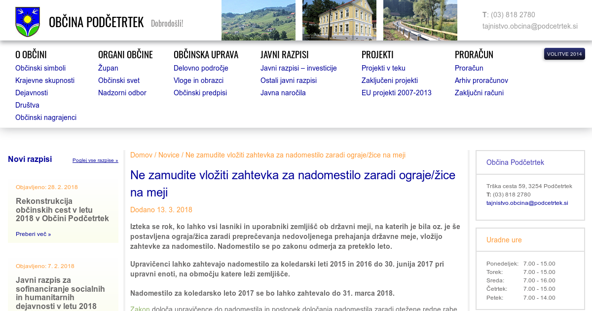 Izteka se rok, ko lahko vsi lasniki in uporabniki zemljišč ob državni meji, na katerih je bila oz. je še postavljena ograja/žica zaradi preprečevanja nedovoljenega prehajanja državne meje, vložijo zahtevke za nadomestilo. Nadomestilo se po zakonu odmerja za preteklo leto. Upravičenci lahko zahtevajo nadomestilo za koledarski leti 2015 in 2016 do 30. junija 2017 pri upravni
