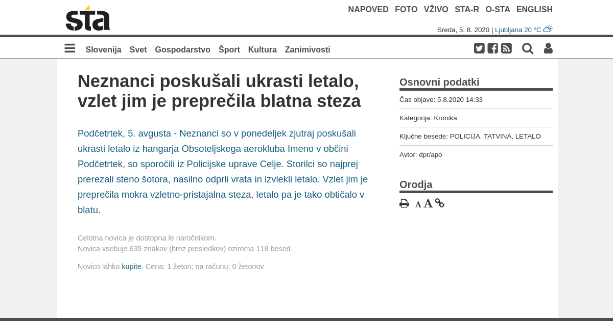 Neznanci so v ponedeljek zjutraj poskušali ukrasti letalo iz hangarja Obsoteljskega aerokluba Imeno v občini Podčetrtek, so sporočili iz Policijske uprave Celje. Storilci so najprej prerezali steno šotora, nasilno odprli vrata in izvlekli letalo. Vzlet jim je preprečila mokra vzletno-pristajalna steza, letalo pa je tako obtičalo v blatu.