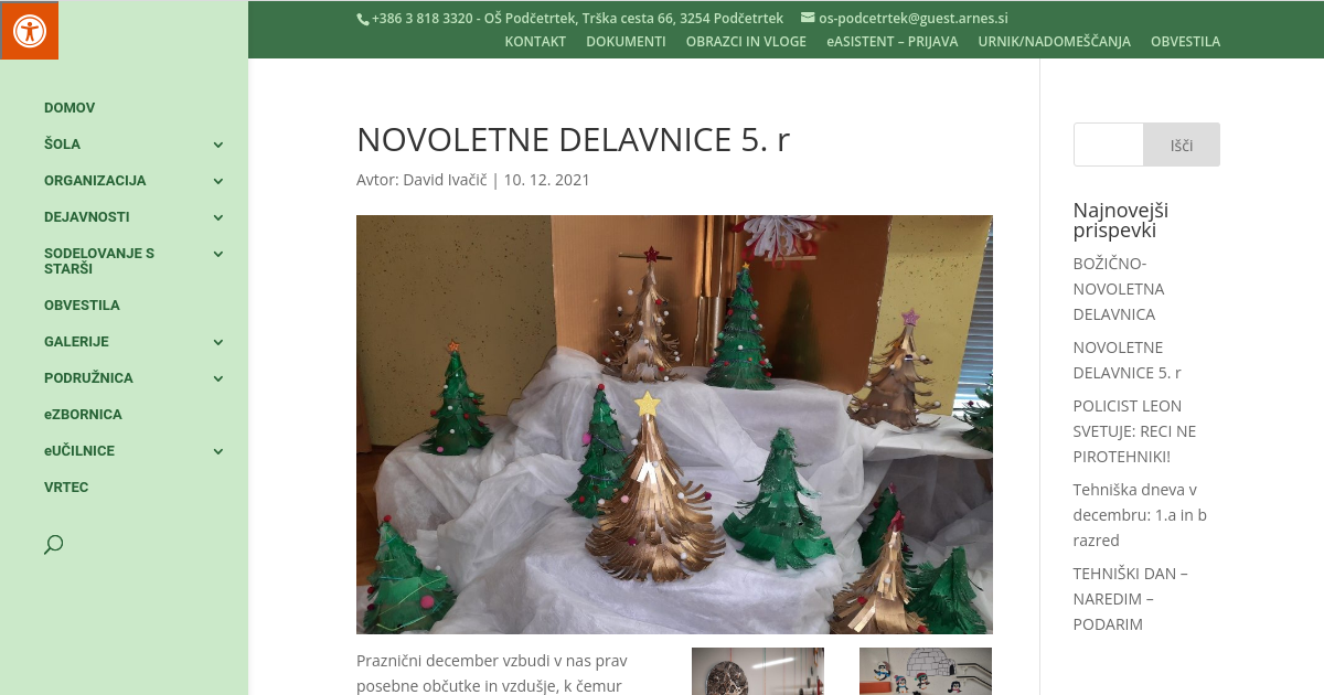 Praznični december vzbudi v nas prav posebne občutke in vzdušje, k čemur pripomorejo tudi manjši izdelki, še posebej, če ji izdelamo sami. Tako so se tega lotili petošolci na tehniškem dnevu NOVOLETNE DELAVNICE, kjer so dokazali svojo ustvarjalnost in dobre ročne spretnosti. Pri delu nam je pomagala študentka pedagoške fakultete v Mariboru, smer razredni pouk, Veronika Grafolj. Ob zvokih božično-novoletnih pesmi in petju so nastajale krasne umetnine, ki krasijo okna razredov, hodnikov ali novoletno drevesce.
