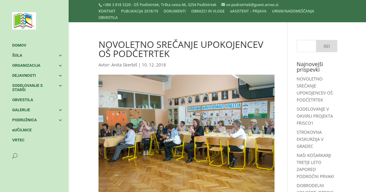 V sredo, 5. 12. 2018, smo v šoli Podčetrtek povabili na tradicionalno svečano kosilo skupaj z druženjem upokojene sodelavce. Učenci so jim pripravili kratek kulturni program, v katerem so se predstavili vsi prvošolci pod mentorstvom učiteljice Nene Hrušovar in glasbena skupina pod mentorstvom učiteljice Mihaele Pihler. Po uvodnem nastopu učencev je sledilo prijetno druženje.