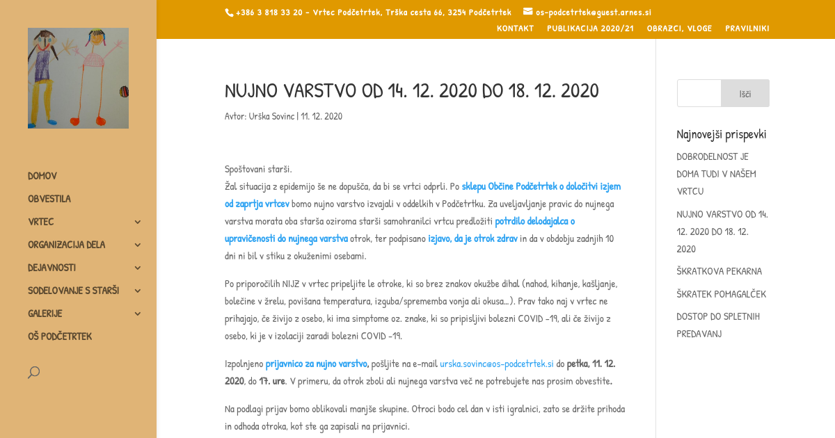 Spoštovani starši. Žal situacija z epidemijo še ne dopušča, da bi se vrtci odprli. Po sklepu Občine Podčetrtek o določitvi izjem od zaprtja vrtcev bomo nujno varstvo izvajali v oddelkih v Podčetrtku. Za uveljavljanje pravic do nujnega varstva morata oba starša oziroma starši samohranilci vrtcu predložiti potrdilo delodajalca o upravičenosti do nujnega varstva otrok, ter podpisano izjavo, da je otrok zdrav in da v obdobju zadnjih 10 dni ni bil v stiku z okuženimi osebami.
