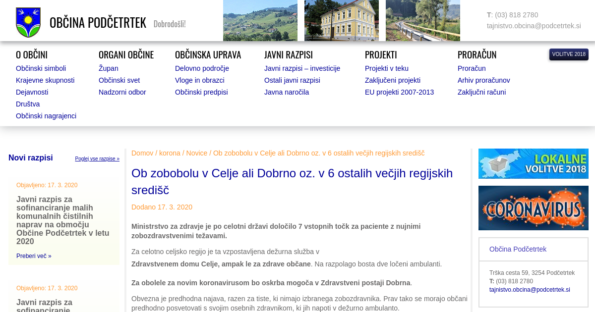 Ministrstvo za zdravje je po celotni državi določilo 7 vstopnih točk za paciente z nujnimi zobozdravstvenimi težavami. Za celotno celjsko regijo je ta vzpostavljena dežurna služba v Zdravstvenem domu Celje, ampak le za zdrave občane. Na razpolago bosta dve ločeni ambulanti. Za obolele za novim koronavirusom bo oskrba mogoča v Zdravstveni postaji Dobrna. Obvezna je predhodna