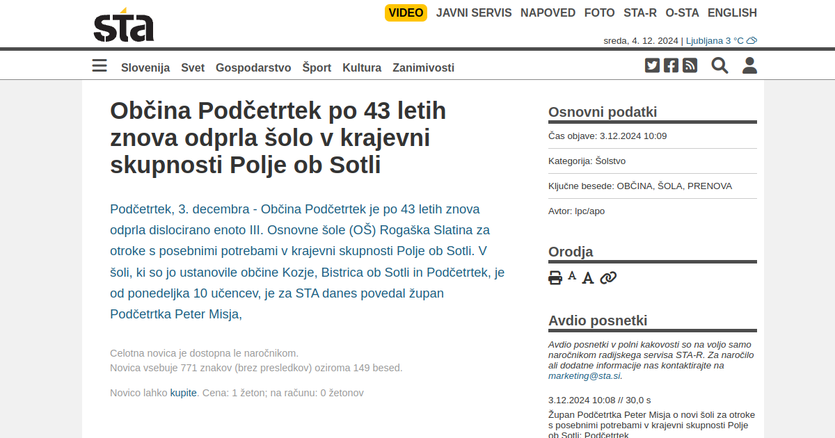 Občina Podčetrtek je po 43 letih znova odprla dislocirano enoto III. Osnovne šole (OŠ) Rogaška Slatina za otroke s posebnimi potrebami v krajevni skupnosti Polje ob Sotli. V šoli, ki so jo ustanovile občine Kozje, Bistrica ob Sotli in Podčetrtek, je od ponedeljka 10 učencev, je za STA danes povedal župan Podčetrtka Peter Misja,