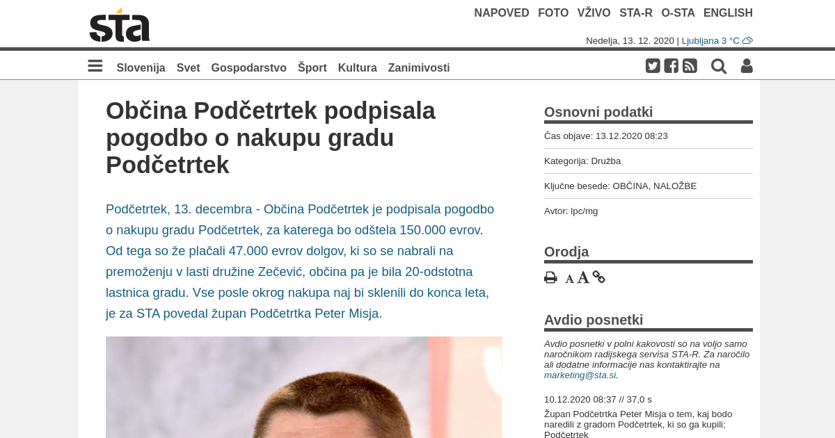 Občina Podčetrtek je podpisala pogodbo o nakupu gradu Podčetrtek, za katerega bo odštela 150.000 evrov. Od tega so že plačali 47.000 evrov dolgov, ki so se nabrali na premoženju v lasti družine Zečević, občina pa je bila 20-odstotna lastnica gradu. Vse posle okrog nakupa naj bi sklenili do konca leta, je za STA povedal župan Podčetrtka Peter Misja.